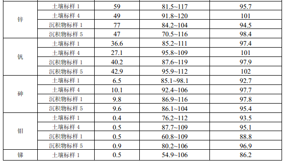 11.4 每批次樣品至少分析 10% 的加標(biāo)回收樣,樣品數(shù)量小于 10 個(gè)時(shí),應(yīng)至少做一個(gè)加標(biāo) 回收樣。加標(biāo)回收樣測(cè)定結(jié)果中,電熱板消解測(cè)定鎘(Cd)、鈷(Co)、銅(Cu)、鉻(Cr)、 錳(Mn)、鎳(Ni )、鉛(Pb)、鋅(Zn)、釩(V)、砷(As)的加標(biāo)回收率應(yīng)控制在 70% ~ 125%之間,鉬(Mo)、銻(Sb)的加標(biāo)回收率應(yīng)控制在 50% ~125%之間;微波消解測(cè)定 12 種金屬元素的加標(biāo)回收率應(yīng)控制在70% ~125%之間。