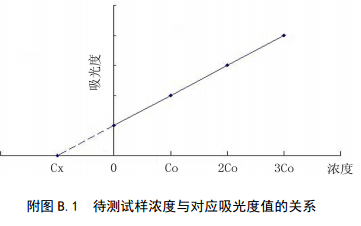 分別量取4等份量待測試樣(濃度為Cx),配制總體積相同的4份溶液。第一份不加標準溶液,第二、三、四份分別按比例加入不同濃度的標準溶液,4份溶液的濃度分別為:Cx、Cx+Co、Cx+2Co、Cx+3Co,加入標準的最小濃度Co≈0.5Cx。用空白溶液調(diào)零,在相同條件下依次測定4份溶液的吸光度值。以吸光度值為縱坐標,加入標準溶液的濃度為橫坐標,繪制校準曲線,曲線反向延伸與橫坐標的交點即為待測樣品的濃度。該方法只適用于濃度和吸光值呈線性的區(qū)域。待測試樣濃度與對應(yīng)吸光度值的關(guān)系見附圖A.1。