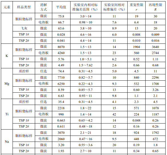 7家實(shí)驗(yàn)室分別對(duì)統(tǒng)一提供的大氣顆粒物標(biāo)樣、濾膜質(zhì)控樣品、飛灰樣品(廢氣顆粒物模擬樣品)和2 個(gè)顆粒物負(fù)載量不同的TSP 樣品,同時(shí)取6 份平行樣品分別進(jìn)行微波消解 (7.2.1.1 )和電熱板消解(7.2.1.2 ),用等離子體發(fā)射光譜法測(cè)量。對(duì)測(cè)定結(jié)果進(jìn)行數(shù)理統(tǒng) 計(jì),得到方法的精密度(各元素測(cè)定值的實(shí)驗(yàn)室內(nèi)標(biāo)準(zhǔn)偏差范圍、實(shí)驗(yàn)室間標(biāo)準(zhǔn)偏差、重復(fù) 性限和再現(xiàn)性限)和方法的準(zhǔn)確度(各元素測(cè)定值的相對(duì)誤差范圍和相對(duì)誤差最終值),詳 見附錄D。
