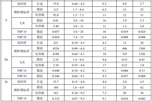 濾膜質(zhì)控樣品由美國職業(yè)健康研究所提供(A-3.1)。顆粒物標(biāo)樣為美國 NIST(1648a)。 樣品消解處理采用硝酸-鹽酸混合溶液(5.6),定容體積為 50.0 ml。不同類型樣品測(cè)定值濃 度(或含量)單位分別為:質(zhì)控樣(μg )、顆粒物標(biāo)樣(μg/g)、飛灰樣品(μg/g)和 TSP 樣品(μg/cm 2 )。其中顆粒物標(biāo)樣中 Al 、Ca、K 元素含量單位為重量百分比(% )。