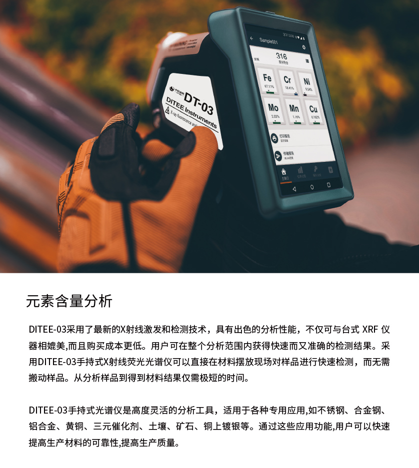DITEE-03手持式光譜儀是一款基于X射線與物質(zhì)之間熒光作用的手持式光譜儀,主要用于檢測材料中的元素含量。這款手持式光譜儀可用于快速檢測不銹鋼、中低合金鋼、工具鋼、模具鋼、黃銅、純銅、青銅、鋁合金、三元催化鉑鈀銠、金銀鉑貴金屬、土壤、礦石、油品等金屬、粉末、液體材料。