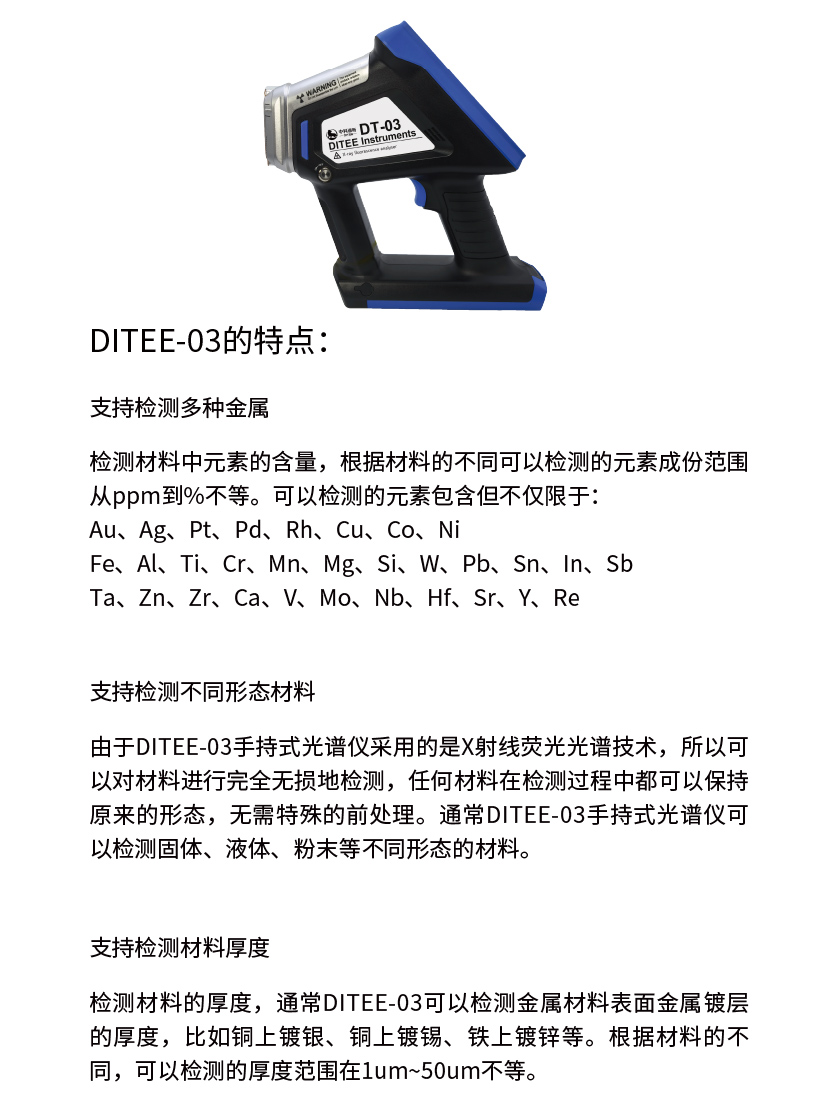 由于DITEE-03手持式光譜儀采用的是X射線熒光光譜技術(shù),所以可以對材料進行完全無損地檢測,任何材料在檢測過程中都可以保持原來的形態(tài),無需特殊的前處理。通常DITEE-03手持式光譜儀可以檢測固體、液體、粉末等不同形態(tài)的材料。