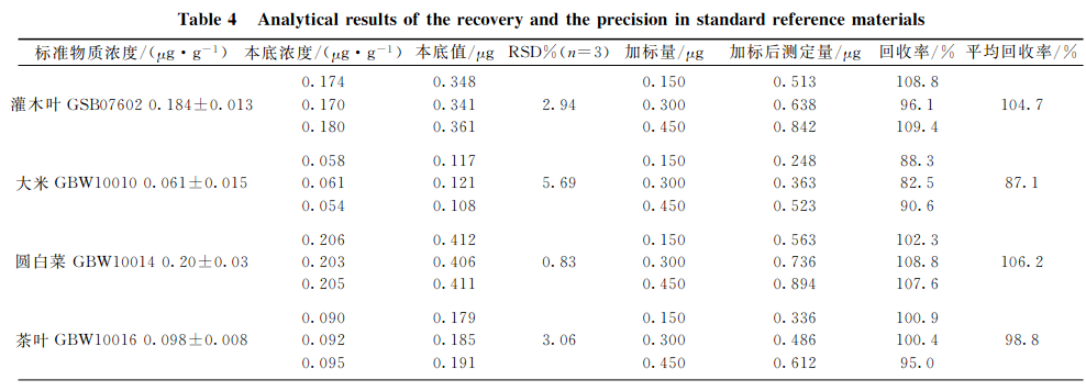 分別選取灌木葉、大米、圓白菜、茶葉和柑橘葉五種植物標準樣品,每種重復3次準確稱取2.0g(精確至0.0001g),按上述實驗條件進行消解,測定本底值。再對每種植物標樣稱取子樣,每種重復3次準確稱取2.0g(精確至0.0001g),此次每種試樣中分別加入1.0mg?L-1硒標準溶液150,300,450gL,進行消解并測定加標后值,同時測定硒質控環境標準溶液(GSBZ50031-94(203710)),結果見表4。可見,硒標準加標回收率在87.1%~106.2%之間,精密度(n=3)在0.83%~5.69%之間,所測結果均與標準物質的參考值吻合,完全達到分析要求。