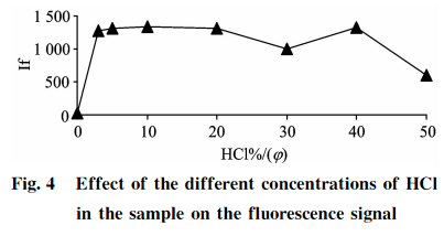 品消化過程的酸度確保了Se+還原成Se+,上機測試前樣品經稀釋后制備液酸度也會影響硒的測定結果。分別吸取100gg?L-標準應用液5.0mL于7個50mL的具塞比色管中,分別加入0.0,1.5,2.5,5.0,10.0,15.0,20.025,0mL濃HCl,用純水稀釋定容至刻度,用以制備不同酸度的10gg?L硒標準溶液,以2.4中的載流和還原劑濃度進行上機測定,結果見圖4。可知,扣除空白后,HCl(g)在3%~20%范圍內,10gg?L-1硒標準溶液具有較強且穩定的熒光強度;當樣品HCl(q)>20%時,硒熒光值受到抑制且不穩定,考慮到樣品酸度的提高有利于硒的還原,同時可以減少共存元素的干擾,故本方法選用15%HCl(g)酸度作為樣品和標準溶液上機測試時制備液的酸度,才能保證測量的穩定性和一致性。