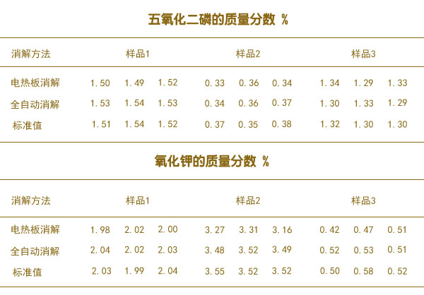 按照不同的濃度要求吸取不同量的磷、鉀標(biāo)準溶液分別置于7個50mL容量瓶中,加水定容,得到不同濃度系列的全磷全鉀混合標(biāo)準溶液系列。將有機肥料樣品1號、2號、3號樣品分別采用電熱板消解、全自動石墨消解儀消解,采用ICP-OES分別對樣品進行三次讀數(shù)。有機肥料中的五氧化二磷及氧化鉀(以烘干基計)平均質(zhì)量分數(shù)測定結(jié)果見表。