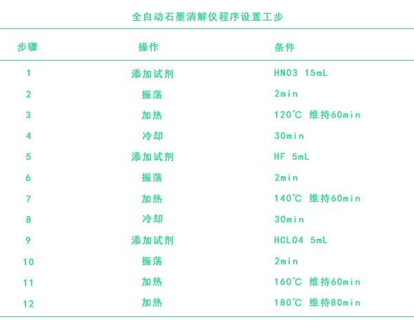 (2)全自動(dòng)消解儀消解法具有操作簡(jiǎn)便、程序自動(dòng)化、無(wú)需人員值守等優(yōu)點(diǎn)。本實(shí)驗(yàn)中全自動(dòng)消解儀消解法采用HNO3+HF+HClO4體系,為研究實(shí)驗(yàn)提供經(jīng)驗(yàn)。