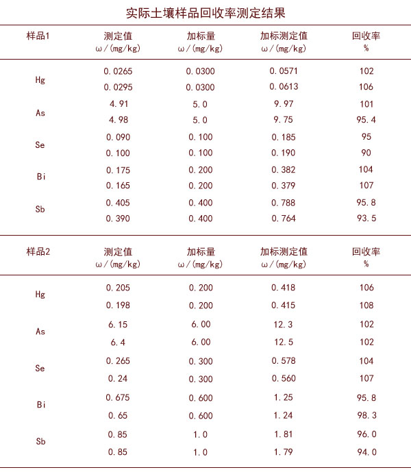 在選定的實驗條件下,取2個實際土壤樣品(分別來自農(nóng)田和某廢物場地)進(jìn)行消解測定,每種樣品平行測定2次。根據(jù)實際樣品的測定結(jié)果,再稱取約0.5000g土壤樣品,向其中加入近似等量的單標(biāo)元素標(biāo)準(zhǔn)溶液,之后再按照試驗方法進(jìn)行消解、測定,每種樣品平行測定2次,結(jié)果見表。