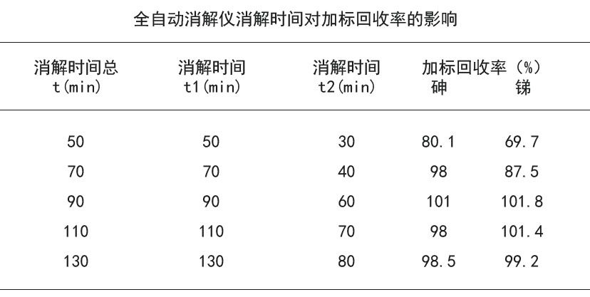 消解時間包括消解時間和趕酸時間,消解和趕酸不完全均影響樣品中As和Sb含量的測定。鑒于沒有尿樣的標準對照樣,實驗中在尿樣加標5μg/L的As和Sb標準混合液,通過計算回收率來考察消解時間對實驗過程的影響。根據電熱板消解經驗確定幾種消解方案,在加6.0ml濃HNO3和1.5ml HClO4的情況下,考察了消解時間(總t)對加標回收率的影響,其中t=t1+t2,消解時間(總t)在70~130min時As的加標回收率滿足條件,在消解時間(總t)90~130min時Sb的加標回收率滿足實驗條件,故選擇消解時間(總t)為90min,見下表。