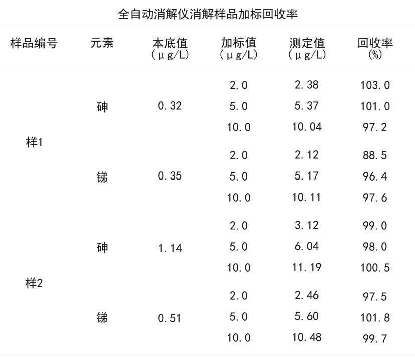 在實際2份尿樣中加入一定濃度的As和Sb標準溶液,測定樣品的加標回收率,結果為As的回收率在97.2~103%之間,Sb的回收率在88.5~101.8%之間,見下表。